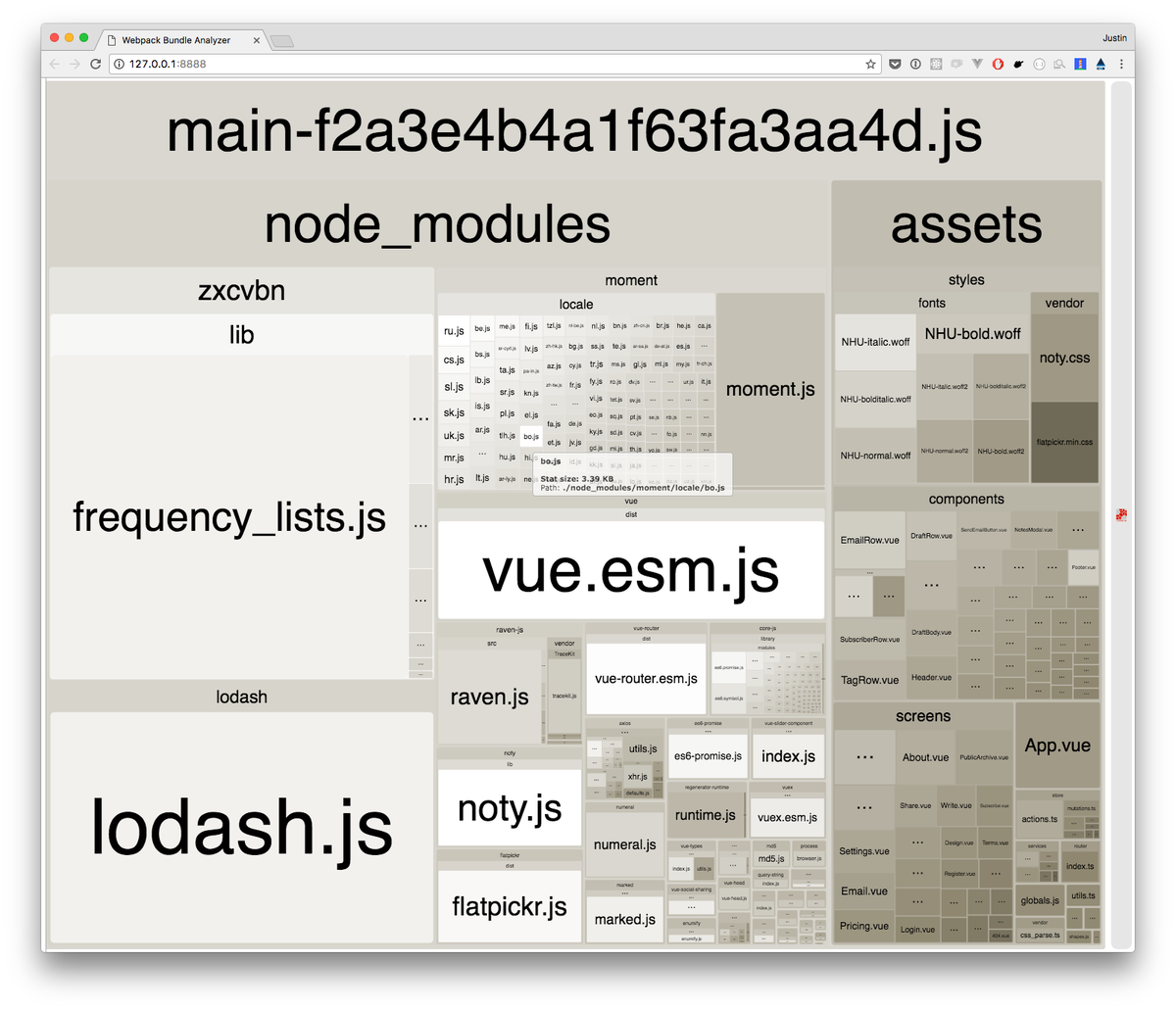 I knew the bundle was big, but I didn’t really know why it was big. Thankfully, there’s a tool for that! webpack-bundle-analyzer analyzes your webpack stats and spits out a tree-map visualizing what’s taking up so much space: